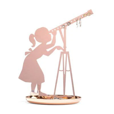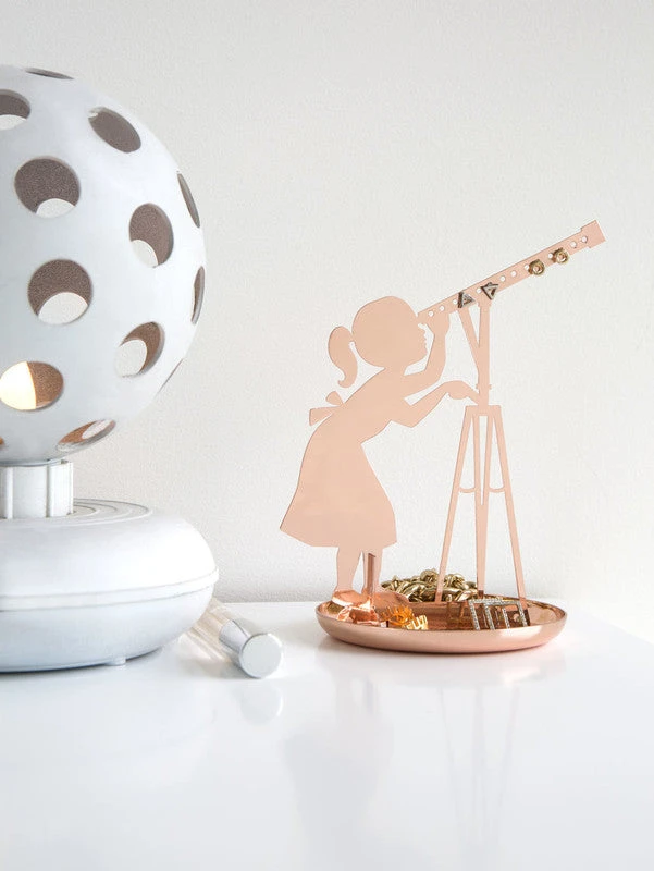 Steel jewelry box with the figure of a girl looking through a copper-colored telescope. Its assembly does not require tools.