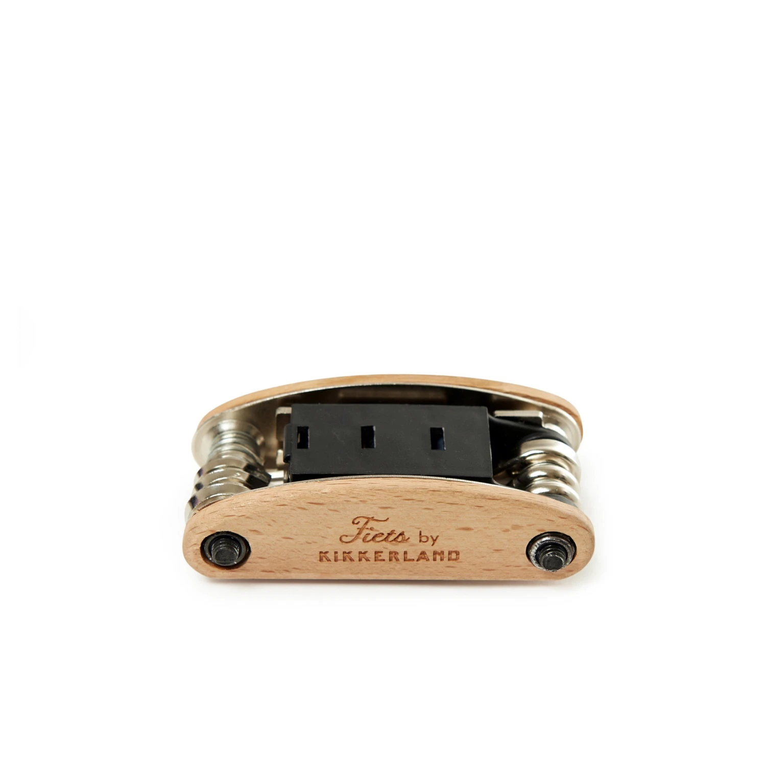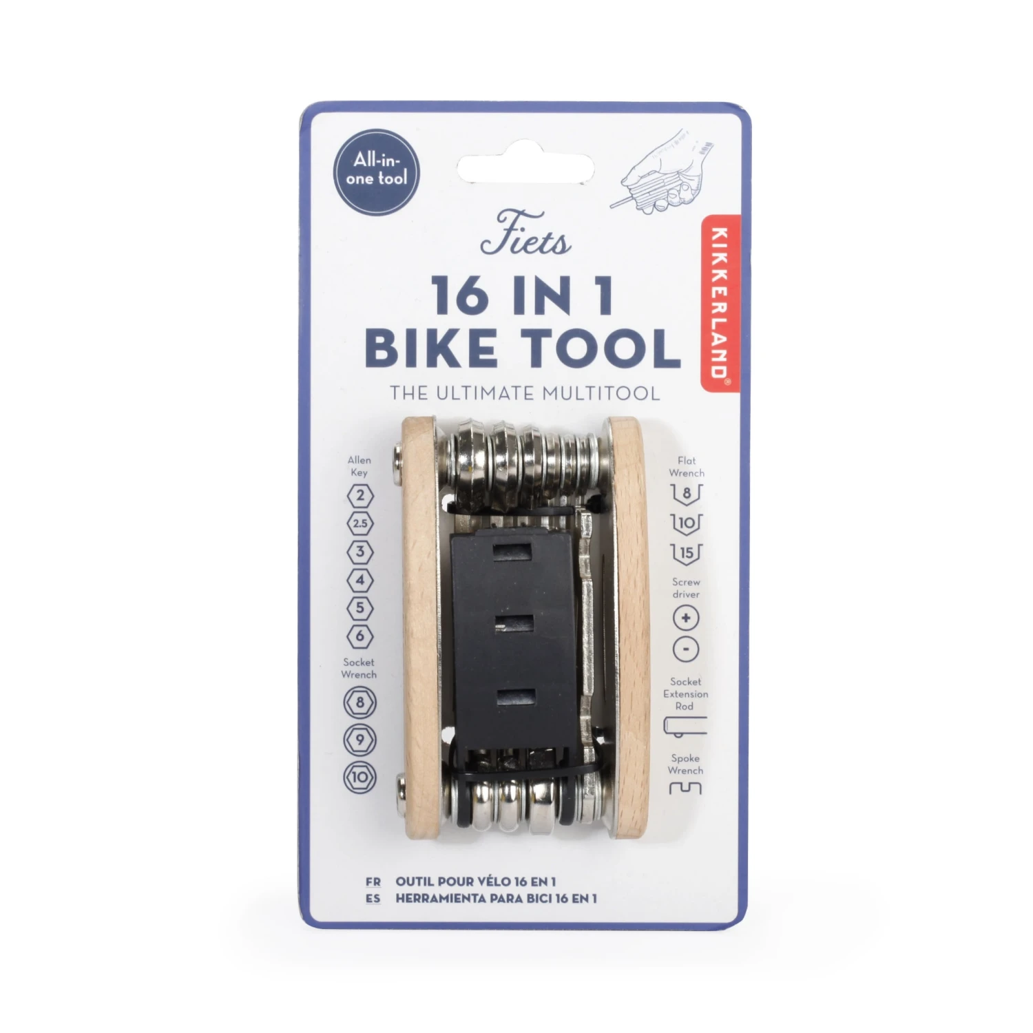 16 different uses include: 2mm allen key; 2.5mm allen key, 3mm allen key, 4mm allen key, 5mm allen key, 6mm allen key, square socket extension rod, 8mm hex, 9mm hex, 10mm hex, Phillips head screwdriver, flathead screwdriver 8mm open end wrench, 10mm open end wrench, 15mm open end wrench, 14GE spoke wrench.
