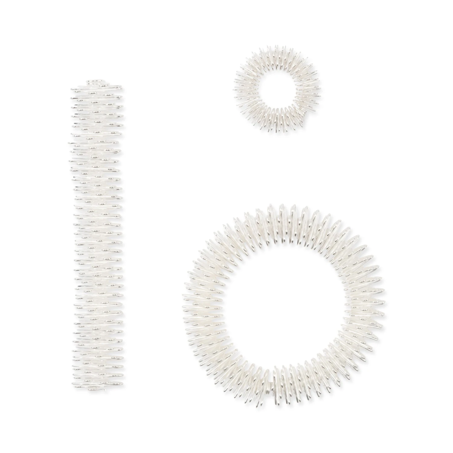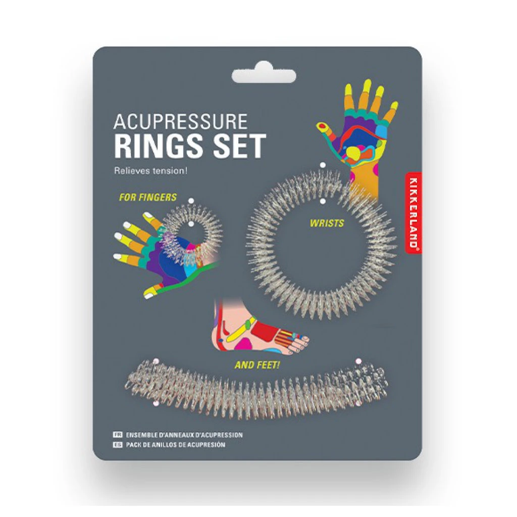 Set of 3 different sized acupressure massage rings for use on your wrist, finger, and foot. Target pressure points to eliminate stress and anxiety, improve focus and concentration.