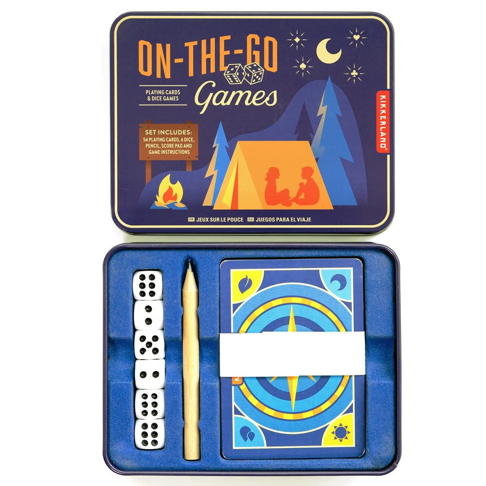 The Kikkerland Outdoor Games Tin kit comes complete with a deck of cards with compass design, 6 dice, pencil, score cards, and instruction booklet for game ideas.