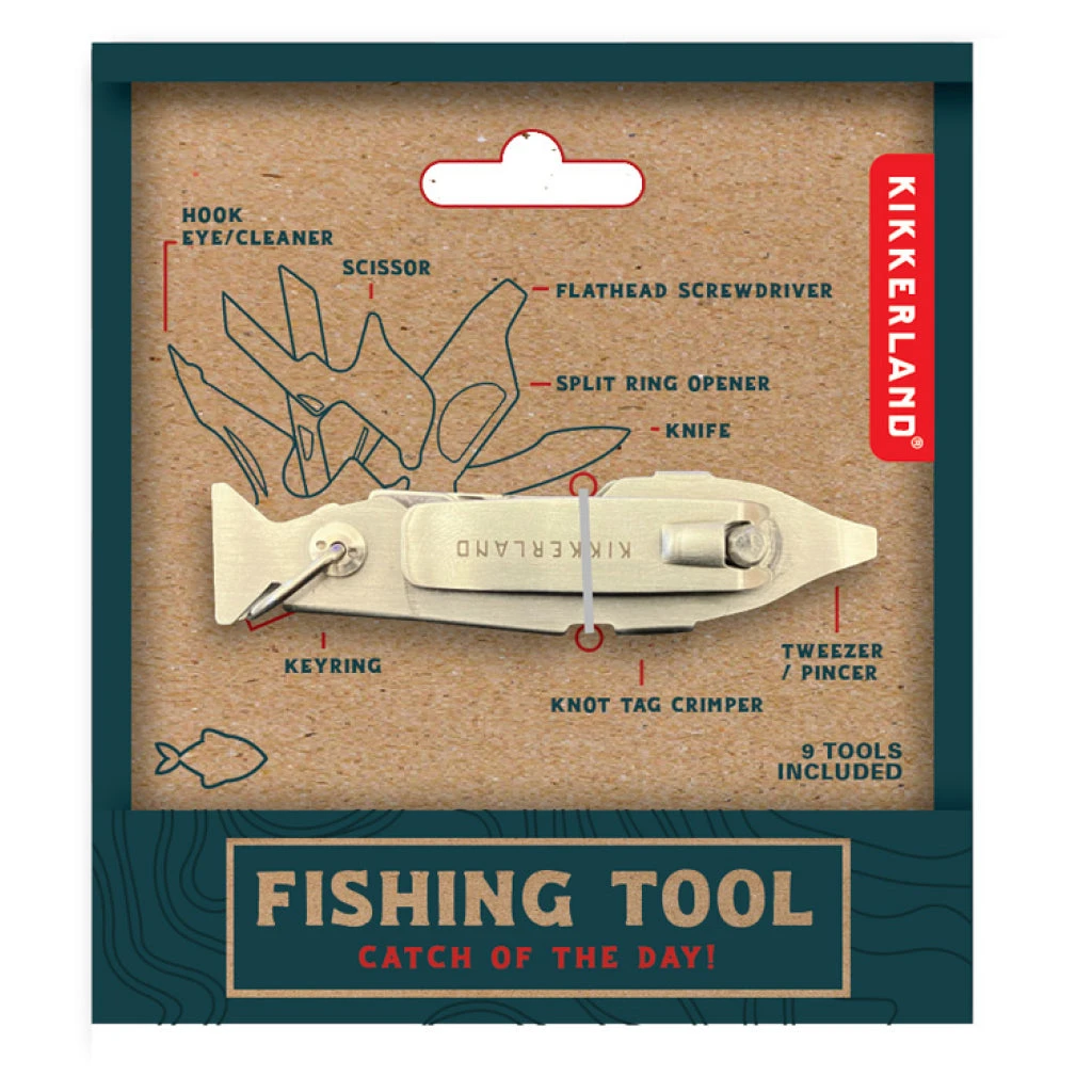 Catch the big one with this Fishing Tool: fish-shaped, 9-in-1 gadget for every angler. Includes scissors, knife, and more, all in stainless steel.