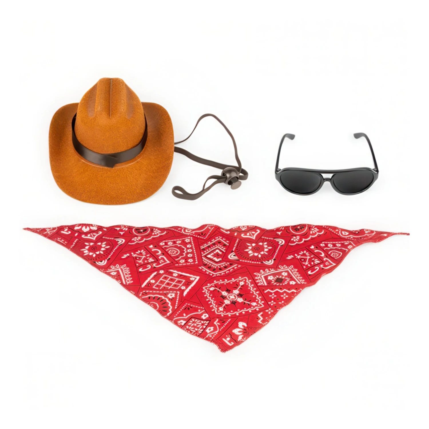 - Includes aviator sunglasses, cowboy hat and bandana