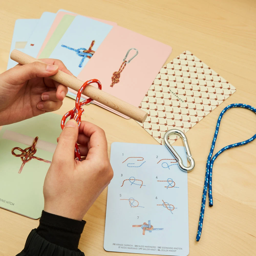 The Kikkerland knot game is a timed skill game that tests your knot-tying abilities. It is made of ABS, sand, pine, iron, paper, polyester and is suitable for ages 8 and above.