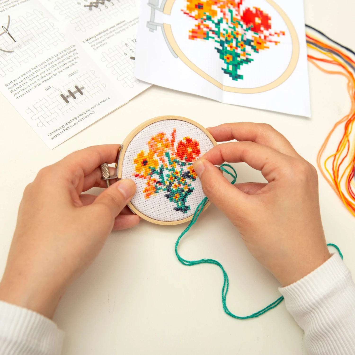 Chill out while mastering flower embroidery. This kit, great for work or home, makes crafting a breeze with its mini embroidery hoop. Perfect for beginners!
