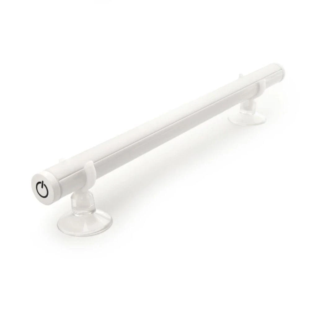 Ideal for bathroom mirrors, this touch activated light bar suctions to flat, non-porous surfaces. Touch end once to turn the light on. Hold to adjust brightness. Requires 4 AAA batteries (not included). Material: aluminium, PP, LED Product: 1,9 x 29,2 x 4,5 cm