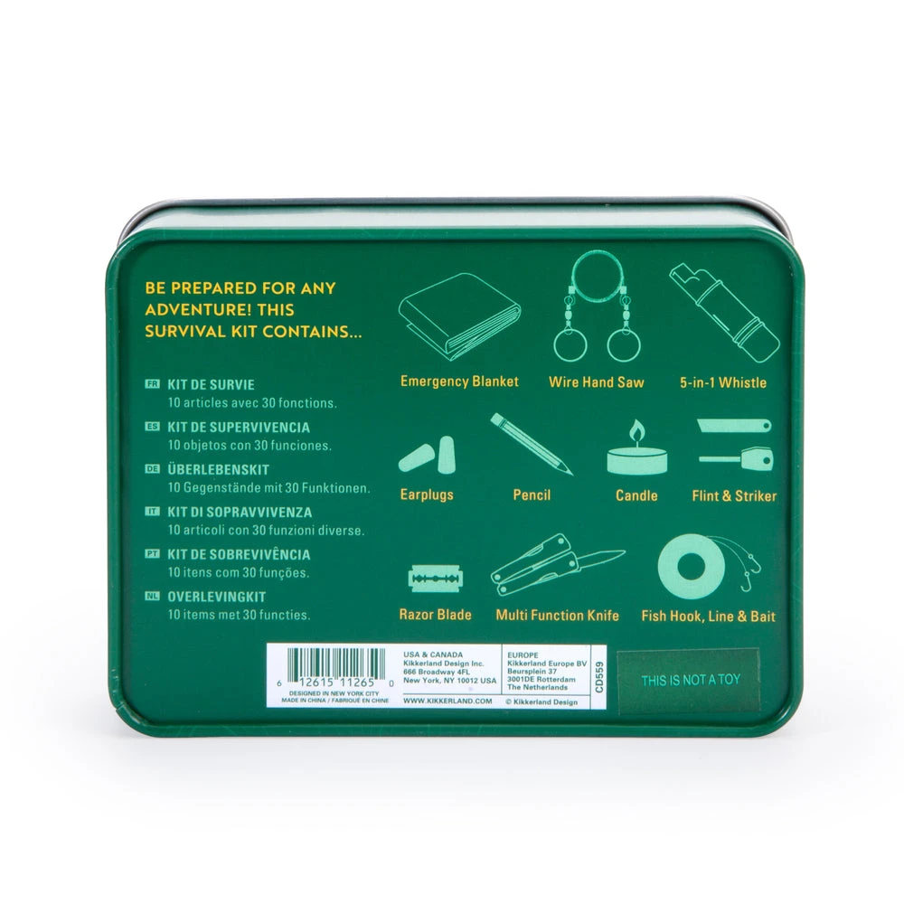 The Kikkerland Survival Kit lets you be prepared for any adventure! Kit contains 10 items with 30 functions. Includes: emergency blanket, wire hand saw, 5-in-1 whistle, earplugs, pencil, candle, flint & striker, razor blade, multi function knife, fish hook, line and bait.