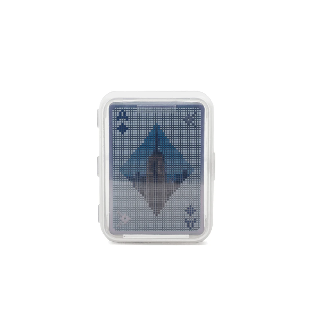 Poker-size playing cards with a pixel design. The pixels are separated by a transparent grid. Moving the cards creates optical effects.