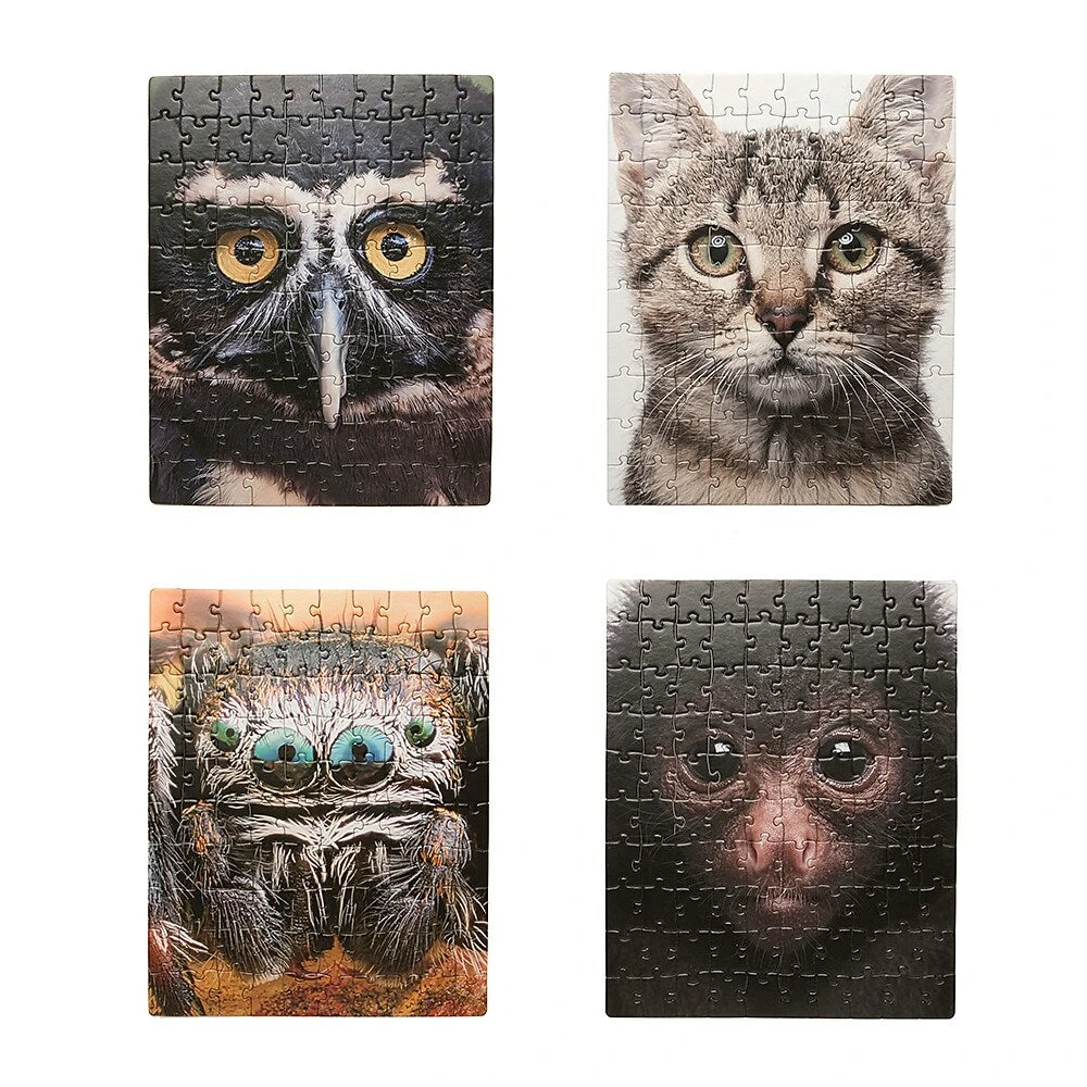 Enclosed are four puzzles that offer four different images, 4x the edges, and interchangeable pieces with color coded backs. A great challenge for experienced puzzlers with many ways to make and play. Each puzzle has 100 pieces.
