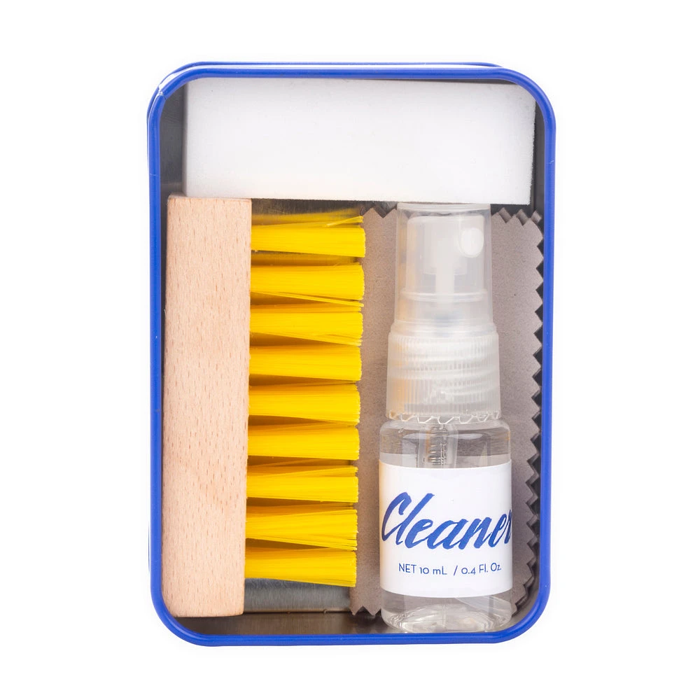Keep your kicks looking fresh with the Kikkerland Sneaker Cleaning Kit. The kit, includes, one beechwood handle bristle brush, one easy erase sponge, one microfiber cloth and 10 ml cleaning solution.